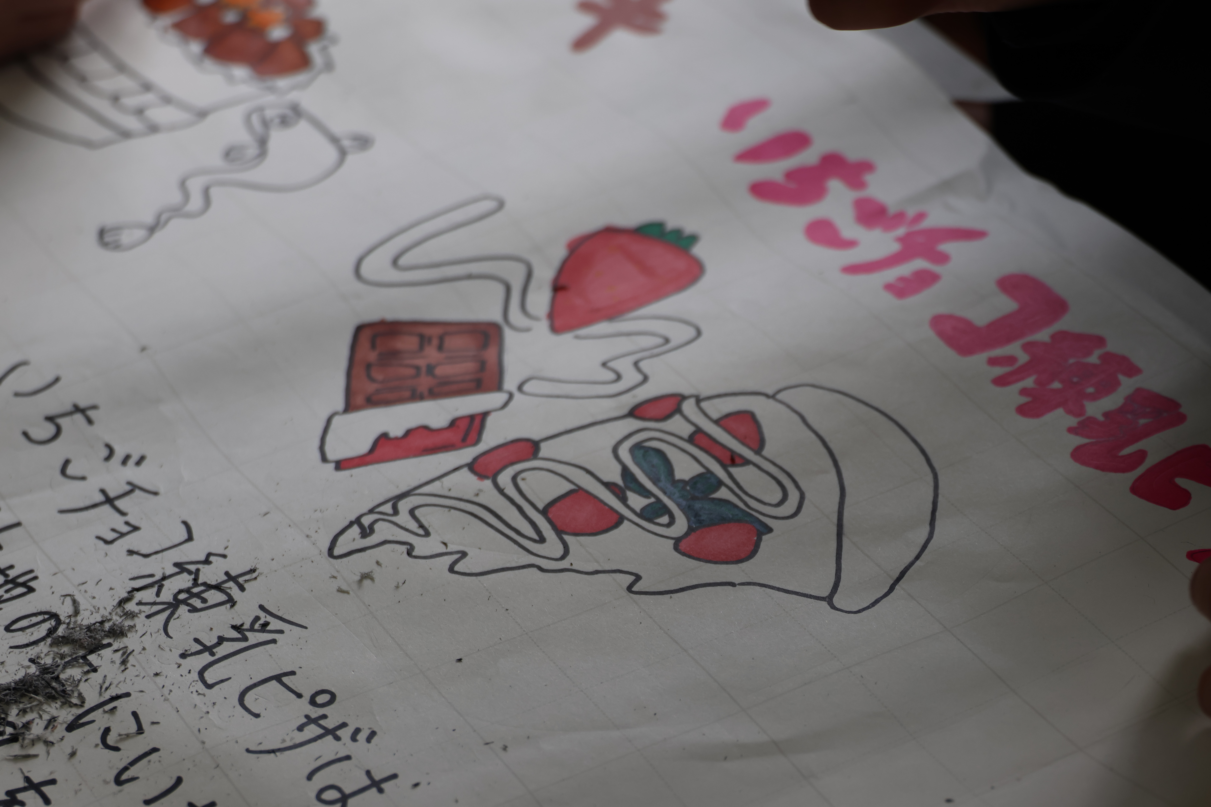 今回は、これまでのグループワークの内容を各グループの発表用わら半紙にまとめる作業を行った。ウナギとイチゴをどのように関連づけて料理に活用できるか、誰に届けるのか、またオリジナルキャラクターなど、各グループの特色が表れた資料となりました。