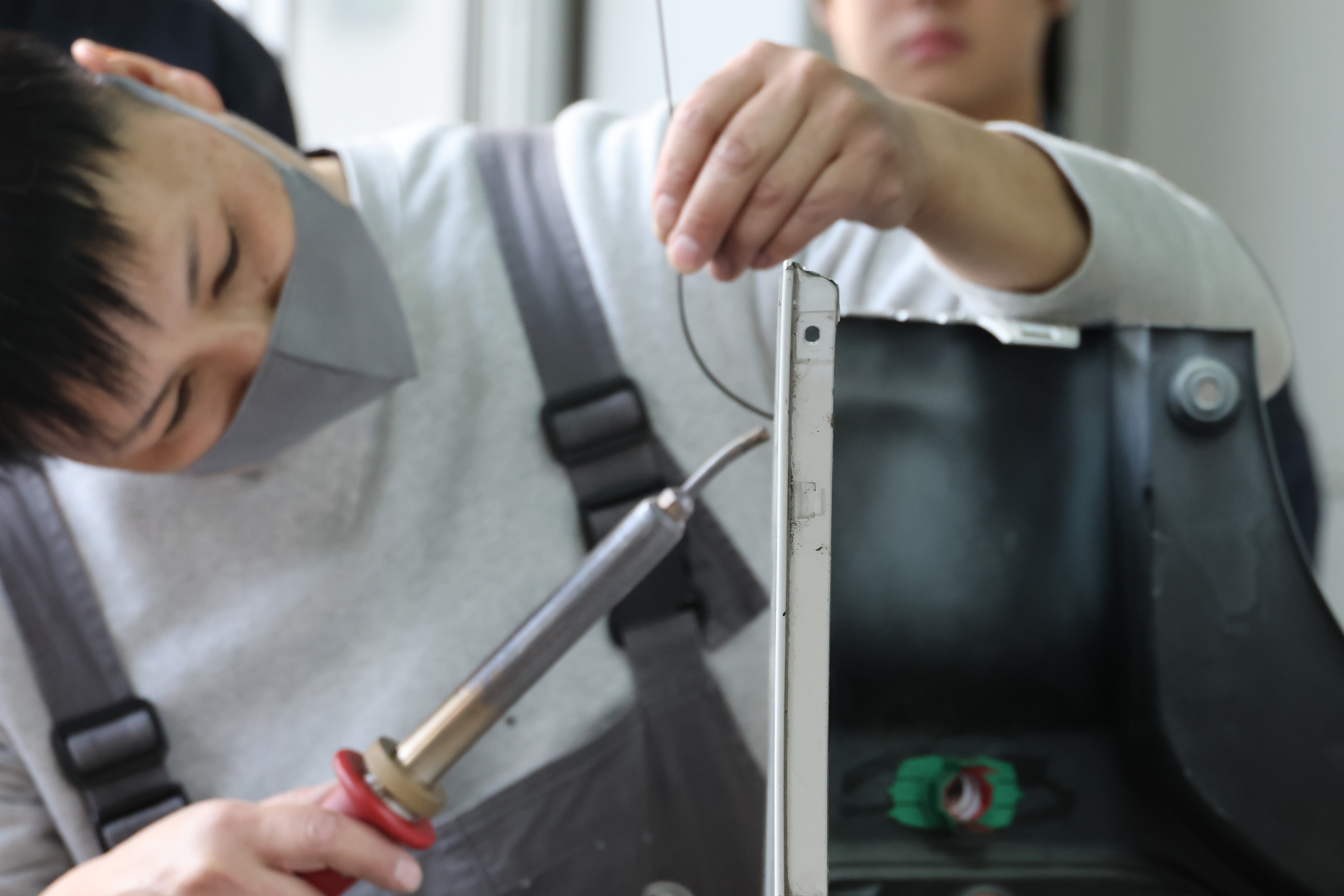 プラスチック溶接では、事故で破損したバンパーなどを単に廃棄して新しい部品に交換するのではなく、極力修理・修復することで廃棄物を減らすためのプラスチック溶接を身近で見学しました。